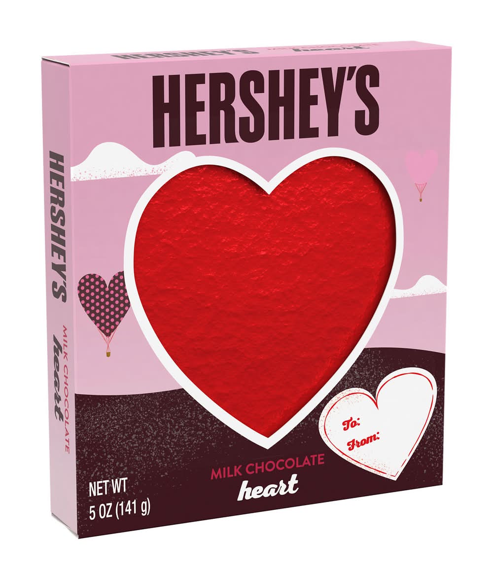 When you need the perfect gift for the ones you love on Valentine's Day, look no further than this HERSHEY'S milk chocolate heart candy. Your special someone, friends, family members and co-workers will love this themed seasonal milk chocolate heart presented in a festive pink gift box that makes it perfect for displaying before you dig in. Complete with "To" and "From" labels for the ideal gift giving experience, this delectable treat provides a heart shaped version of the classic HERSHEY'S milk chocolate you already know and love. This HERSHEY'S Valentine's Day candy is kosher certified and wrapped in shiny red foil for a festive touch. Add this treat to your movie night snack selection, edible decorative displays, Valentine's Day party goodies and more. Pair it with flowers for the perfect gift for a special someone, or break it apart to share with friends and family to show your love. Try it chilled in the fridge, melted for dipping strawberries or straight from the stunning red foil wrapper. Or, use this milk chocolate heart candy to top cookies, brownies and cupcakes to share with everyone you love this Valentine's Day. Just don't forget to save some for yourself during all that sharing. Cantidad de porciones: 5