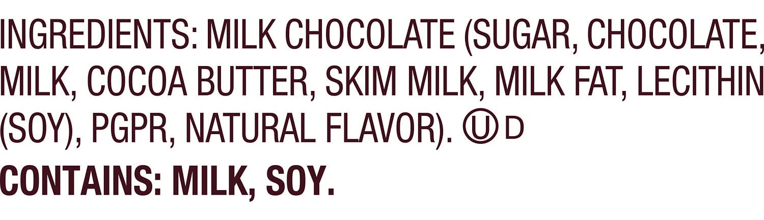 Ingredientes: MILK CHOCOLATE [SUGAR; MILK; COCOA BUTTER; CHOCOLATE; MILK FAT; LECITHIN (SOY); NATURAL FLAVOR] Contiene: 'Contains Milk', 'Contains Soybeans'