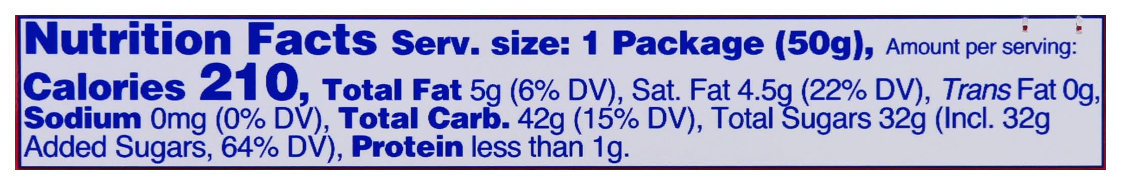 Ingredientes: Glucose Syrup, Sugar, Vegetable Oil (Hydrogenated Palm Kernel Oil, Palm Kernel Oil), Less than 2% of Gelatin, Natural and Artificial Flavors, Malic Acid, Citric Acid, Strawberry Juice Concentrate, Sucrose Fatty Acid Esters, Sorbitan Monostearate, Purple Carrot Juice (Color), Soy Lecithin Contiene: Soybeans, Milk