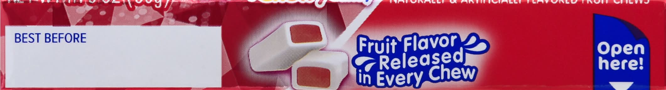 Naturally & artificially flavored fruit chews. Gluten-free. Immensely fruity. Intensely chewy candy. Fruit flavor released in every chew. No synthetic colors. • Sabor: Strawberry • Morinaga America, Inc., Irvine, CA, 92614