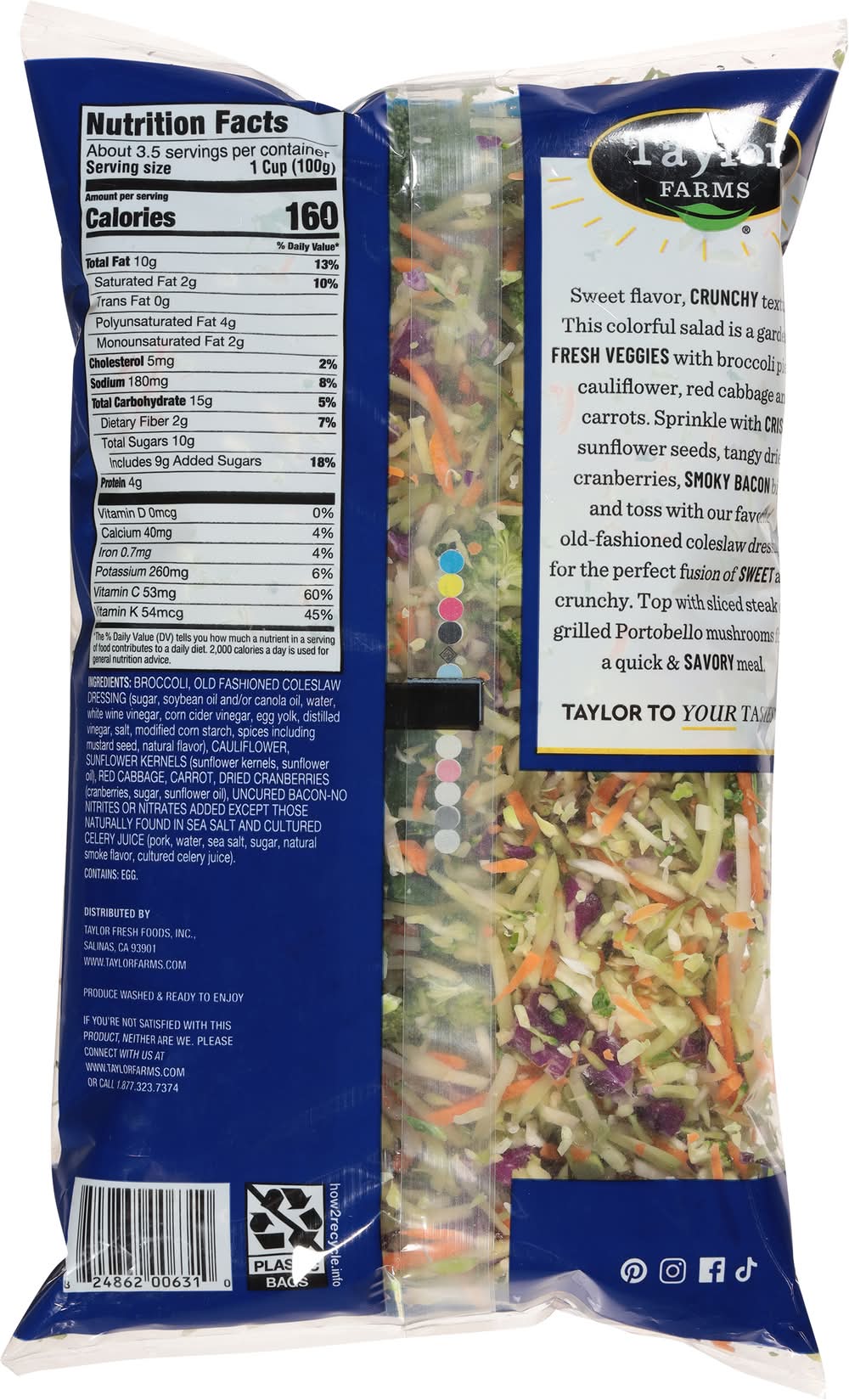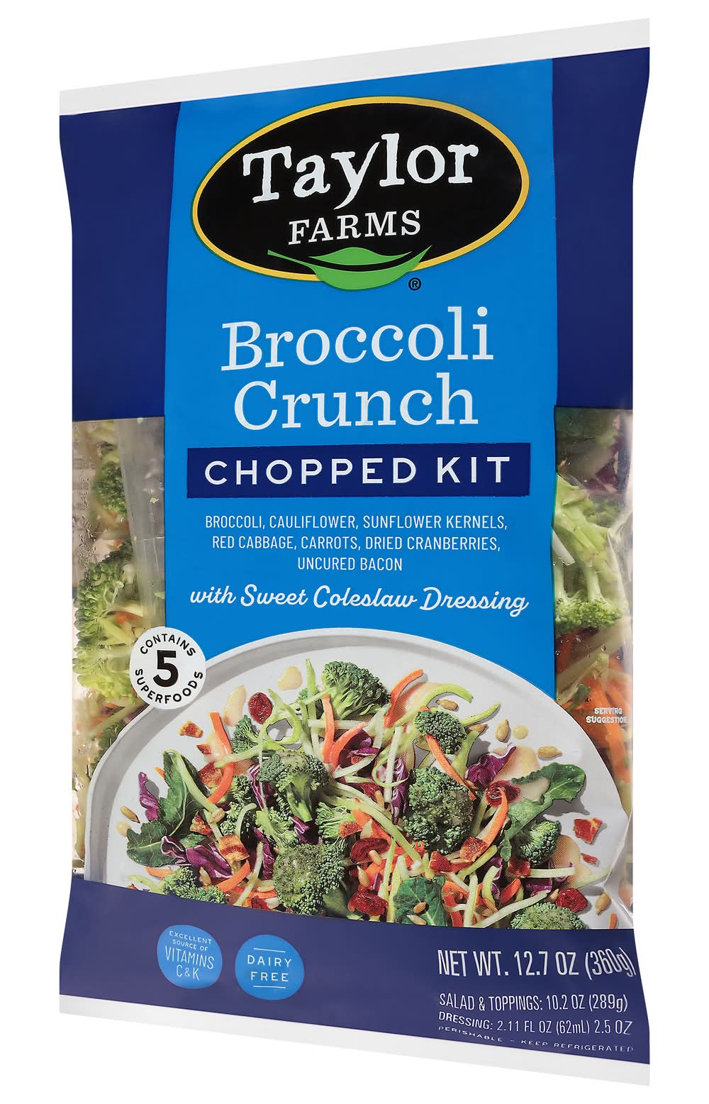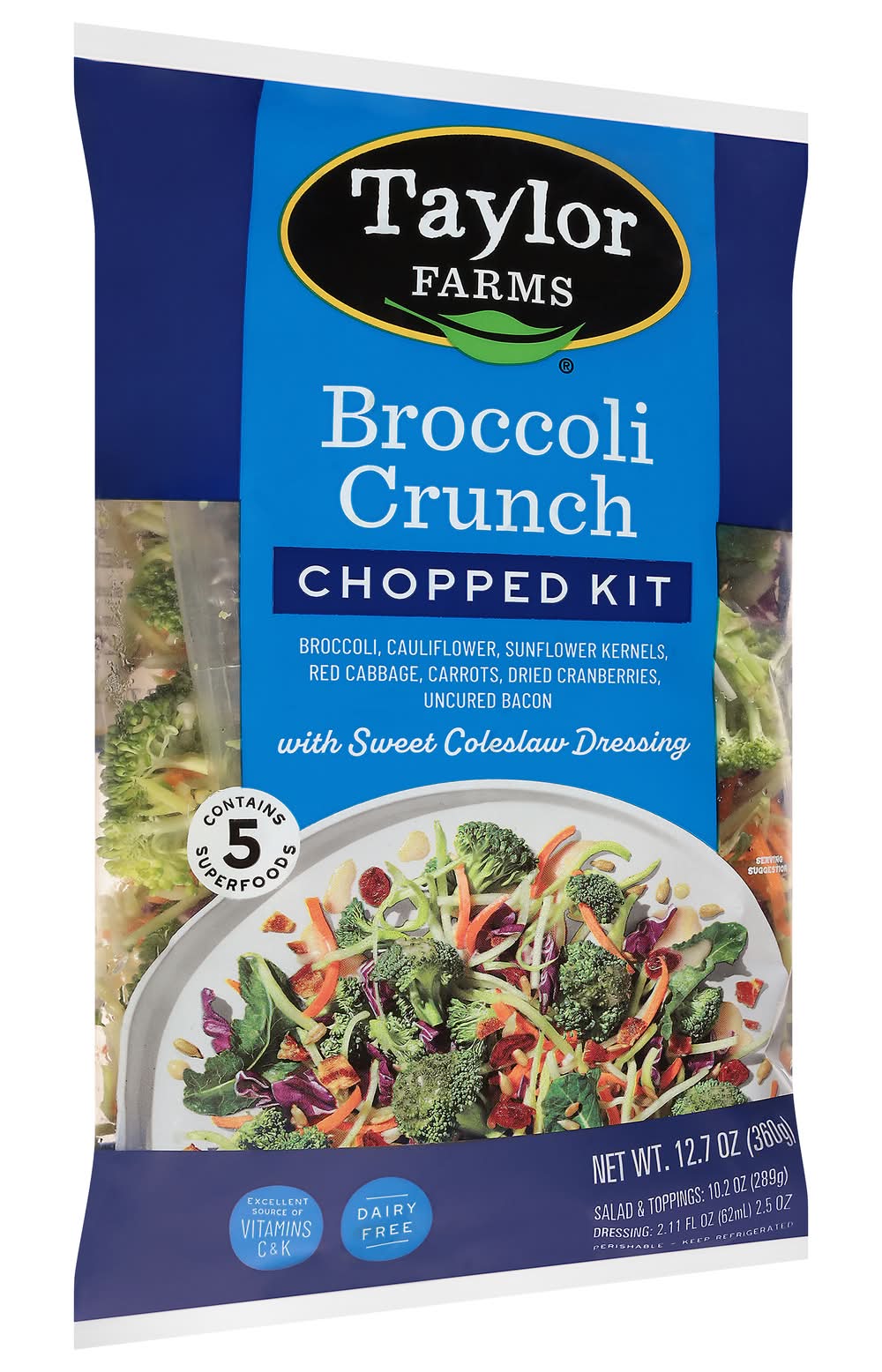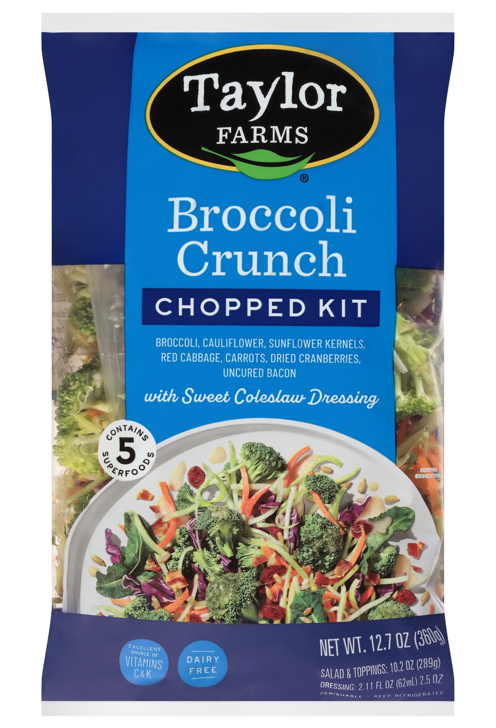 Broccoli Crunch Chopped Kit with Sweet Coleslaw Dressing • Taylor Fresh Foods, Inc., Salinas, CA,93901 • Empaque: Reutilizable