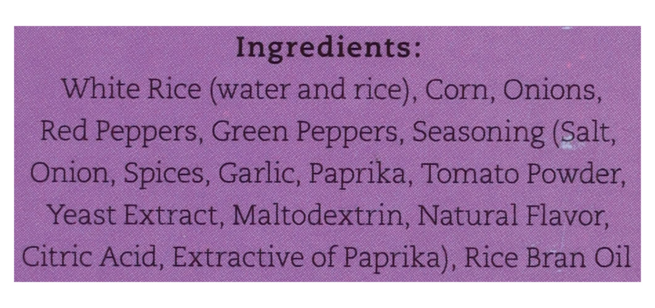 Ingredientes: White Rice (Water and Rice), Corn, Onions, Red Peppers, Green Peppers, Seasoning (Salt, Onion, Spices, Garlic, Paprika, Tomato Powder, Yeast Extract, Maltodextrin, Natural Flavor, Citric Acid, Extractive of Paprika), Rice Bran Oil Contiene: Corn