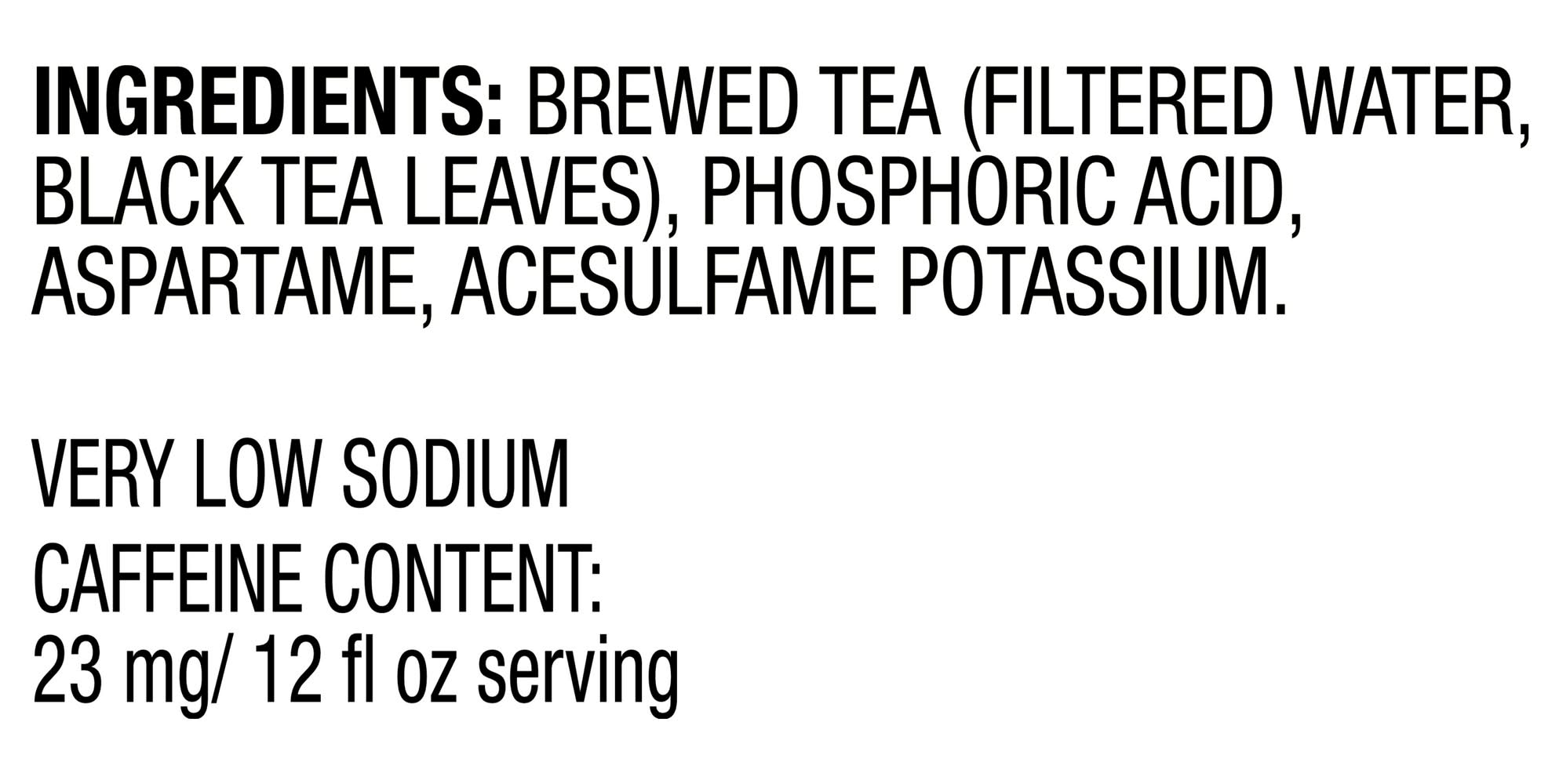 Ingredientes: Ingredients: Brewed Tea (Filtered Water, Black Tea Leaves), Phosphoric Acid, Aspartame, Acesulfame Potassium. Contiene 23mg de cafeína