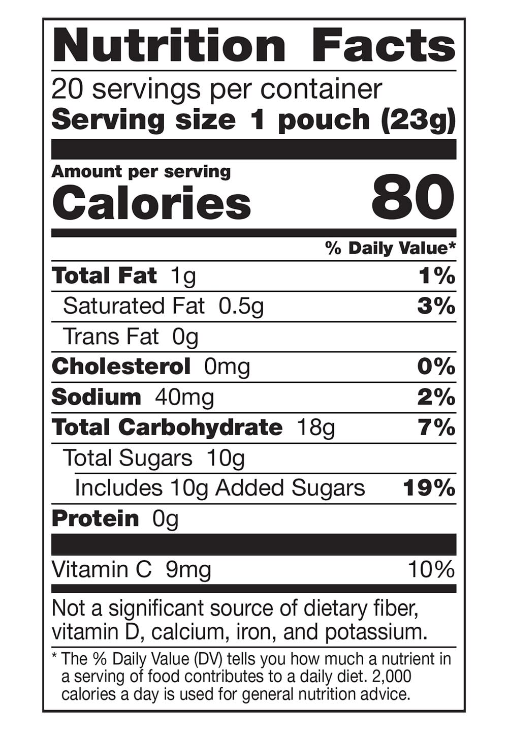 Ingredientes: Tropical: Corn Syrup, Sugar, Pear Puree, Modified Corn Starch, Fructose, Maltodextrin, Palm and/or Palm Kernel Oil, Contains 2% or Less of: Cottonseed Oil, Glycerin, Grape Juice Concentrate, Citric Acid, Carrageenan, Monoglycerides, Sodium Citrate, Malic Acid, Vitamin C (Ascorbic Acid), Potassium Citrate, Agar-Agar, Natural and Artificial Flavor, Xanthan Gum, Color (Red 40, Blue 1, Yellows 5 & 6). Strawberry: Corn Syrup, Sugar, Pear Puree, Modified Corn Starch, Fructose, Maltodextrin, Palm and/or Palm Kernel Oil, Contains 2% or Less of: Cottonseed Oil, Glycerin, Grape Juice Concentrate, Citric Acid, Carrageenan, Monoglycerides, Sodium Citrate, Malic Acid, Vitamin C (Ascorbic Acid), Potassium Citrate, Agar-Agar, Natural Flavor, Red 40, Xanthan Gum.