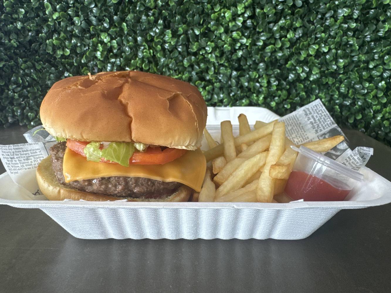 100% carne angus en pan kaiser rolls. servido con queso americano, mayonesa, ketchup, lechuga, tomate y cebolla. Incluye refresco o agua y papas fritas.