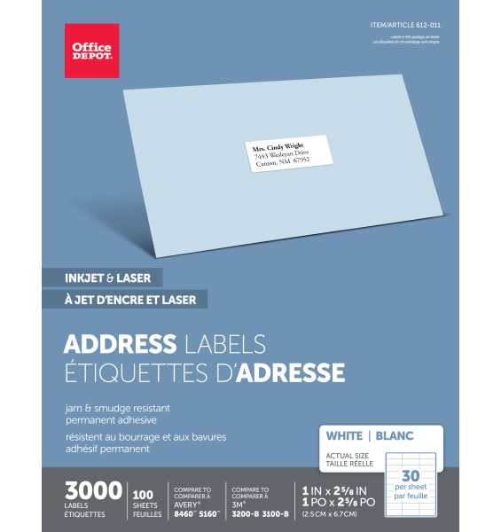 Office Depot Inkjet & Laser Address Labels, 2.5x6.7 cm, White (3000 ct)